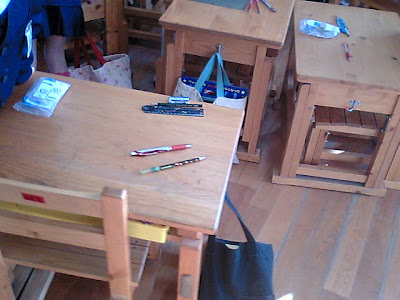 2週間ぶりに全員がそろいました。ちょっと遅れましたが、席替えをしました。写真は、新しい座席へ机を移動しているところです。